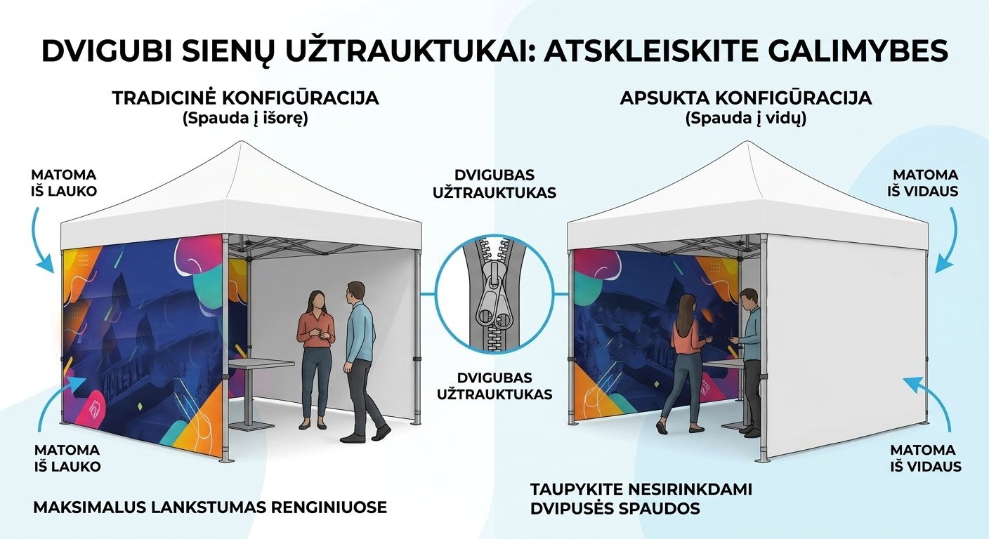 Dvigubi sienų užtrauktukai yra praktiškas ir ekonomiškas sprendimas, kai norite maksimaliai išnaudoti vienpusės spaudos sieną. Dažniausiai prekybinės palapinės montuojamos spauda į išorę, tačiau renginių metu poreikiai gali keistis – šis priedas suteikia jums reikiamą lankstumą.