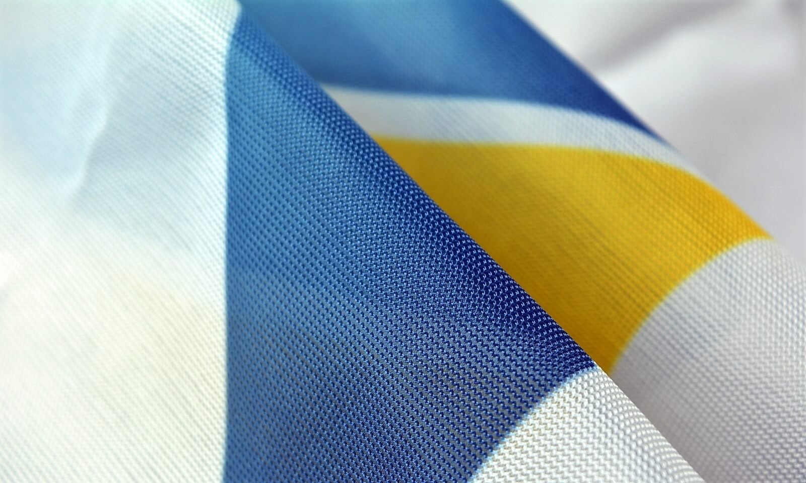Vėliavos spausdinamos ant specialaus vėliavinio 110 g/m2 poliesterio audinio.