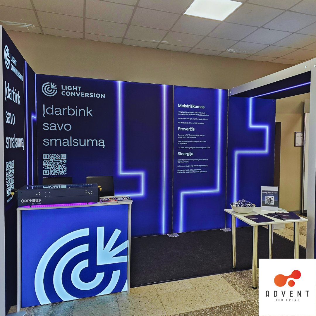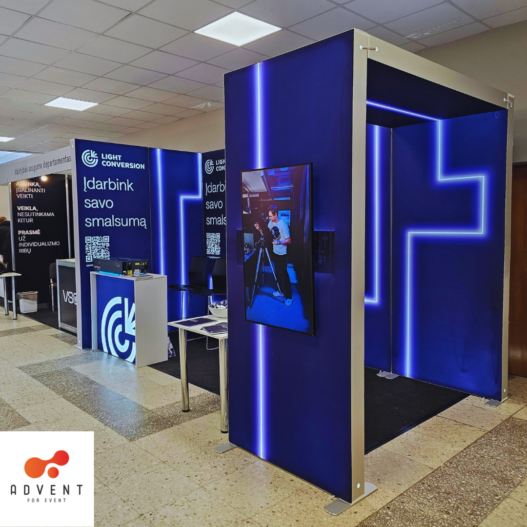 85×250 cm / 100x200cm / 100x250cm / 300×250 cm matmenų šviečiantis parodų stendas. Vidinis LED apšvietimas ir spauda ant tekstilės iš abiejų stendo pusių. Tvirtas ir lengvai surenkamas aliuminio rėmas.